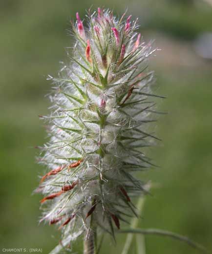 Fleurs roses, petites, en têtes oblongues-coniques ou cylindriques (2 à 8 cm), solitaires terminales. Calice à 5 dents de 6 mm, progressivement effilées, longues, à 1 nervure, étroites et ciliées, +/- raides et épineuses, étalées en étoile à la maturité. Corolle pas plus longue que les dents du calice ;