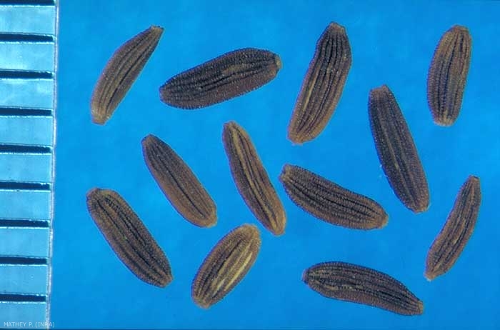 Forme : fusiforme comprimé en 2 faces planes (0,2 mm d'épaisseur). Aigrette blanche fugace ;