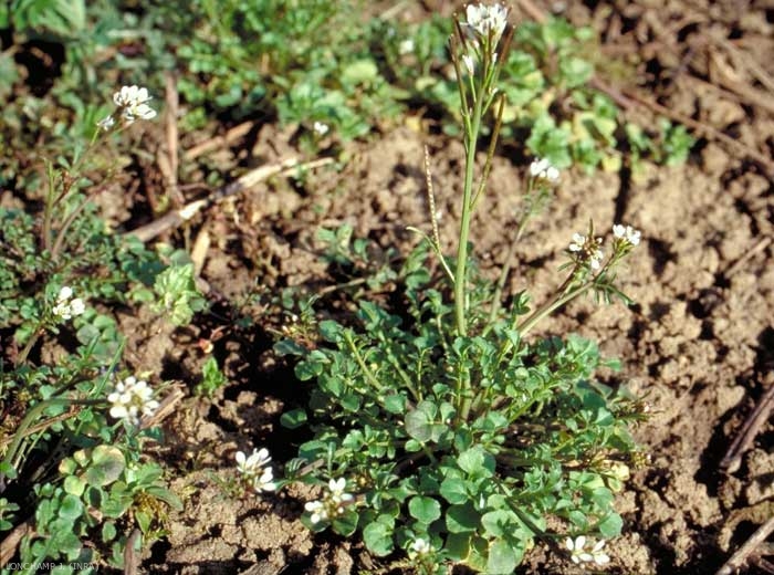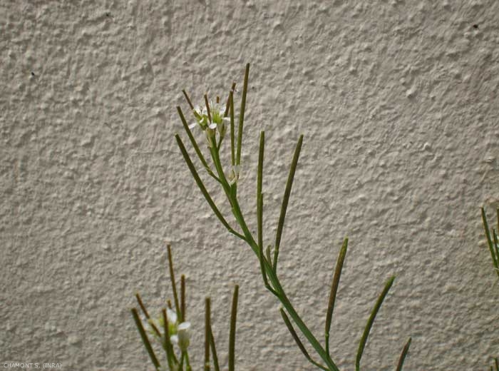 Fleurs blanches, petites, disposées en grappes, longuement dépassées par les siliques inférieures