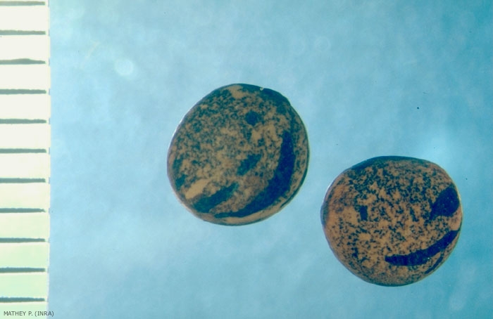 Forme : arrondie +/- aplanie latéralement. Hile constitué de 2 lèvres jointes intégrées à la graine ;