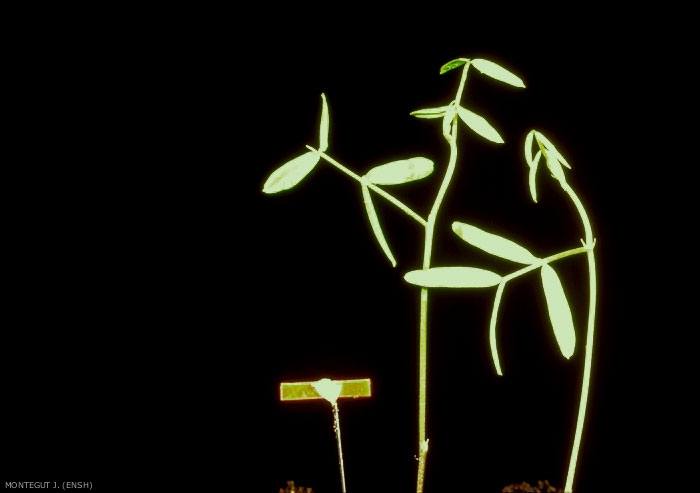 Feuilles à 5 à 8 folioles, terminées par une vrille ramifiée. Folioles tardives lancéolées, tronquées, avec une pointe épineuse au bout de la nervure médiane. Tache noire sur les stipules ;
