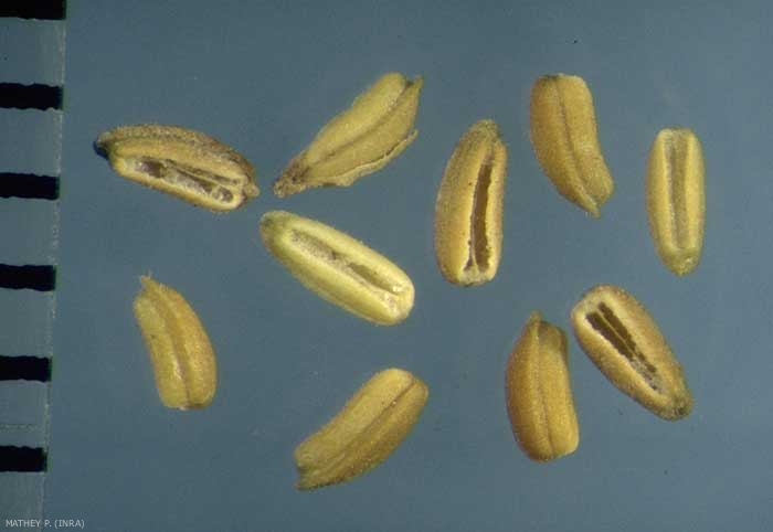Forme : forme générale ovoïde allongée presque prismatique à profond sillon ventral large, section plan convexe. La face convexe débordant en bouclier ;