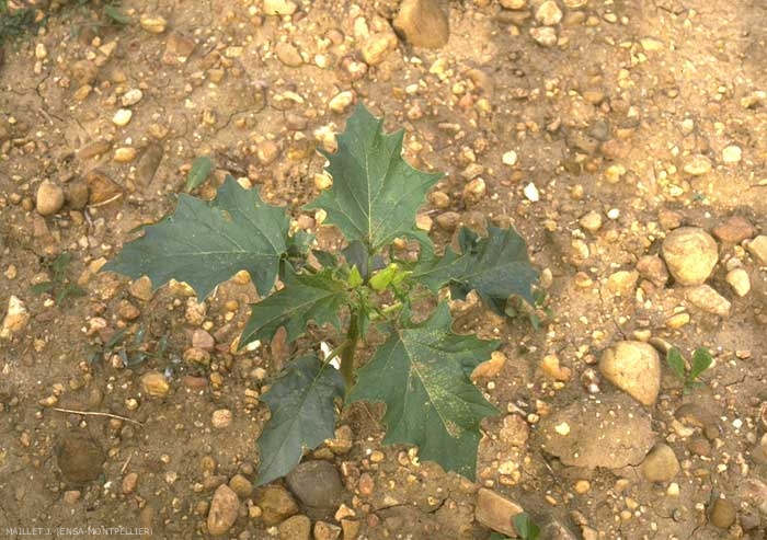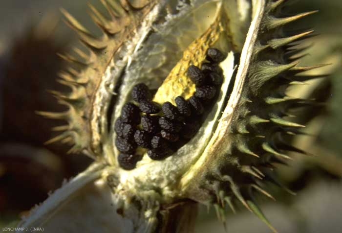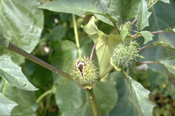 Fruits : capsules grosses comme une noix, dressées, ovales, chargées d'aiguillons robustes (pomme épineuse) ;