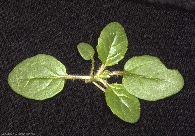 Feuilles inférieures opposées, les suivantes alternes. Feuilles ovales, moyennement hastées, à bords entiers, surface velue, vert corsé à vert gris, à pétiole court. Densité importante de la pilosité foliaire