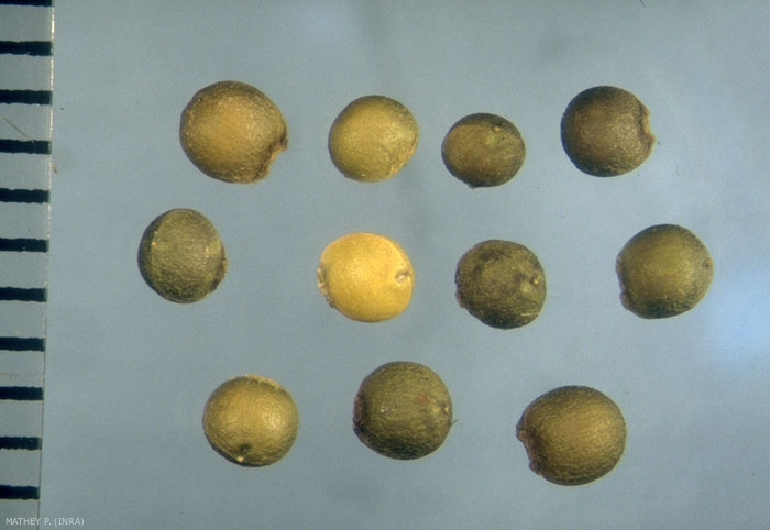 Forme : subglobuleuse à ovoïde avec hile important déformant la forme générale sphérique de la semence. Partie apicale légèrement apiculée, mais sans bec