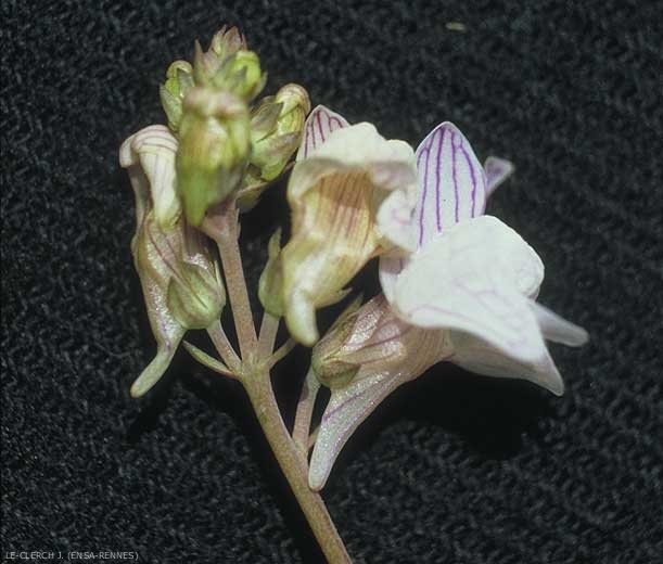 Fleurs blanches, petites, nombreuses, ordinairement striées de violet, à renflement de la gorge de couleur jaune, en grappe. Fleur à éperon droit. Bractée linéaire ;