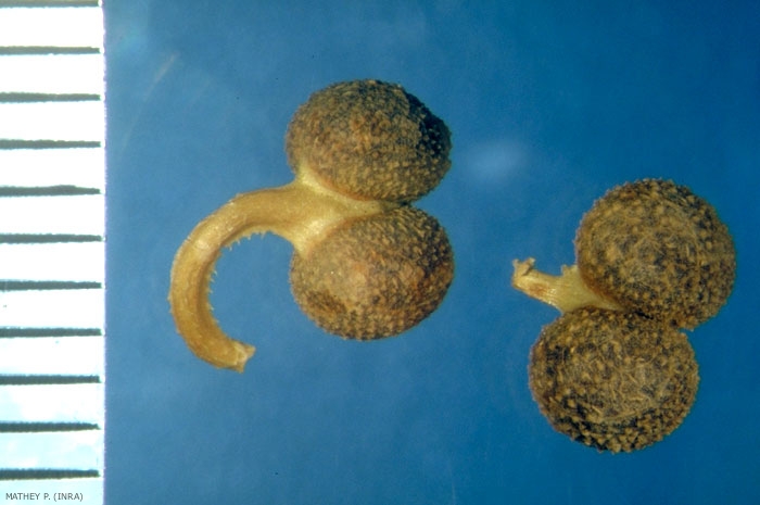 Forme : semence globuleuse, sphérique, aplanie au niveau de la cuvette hilaire