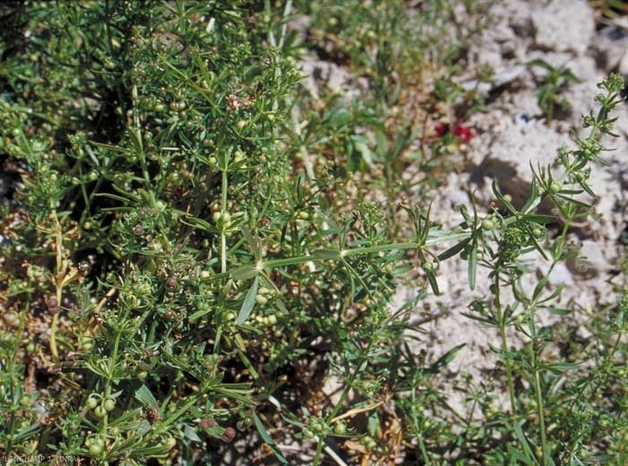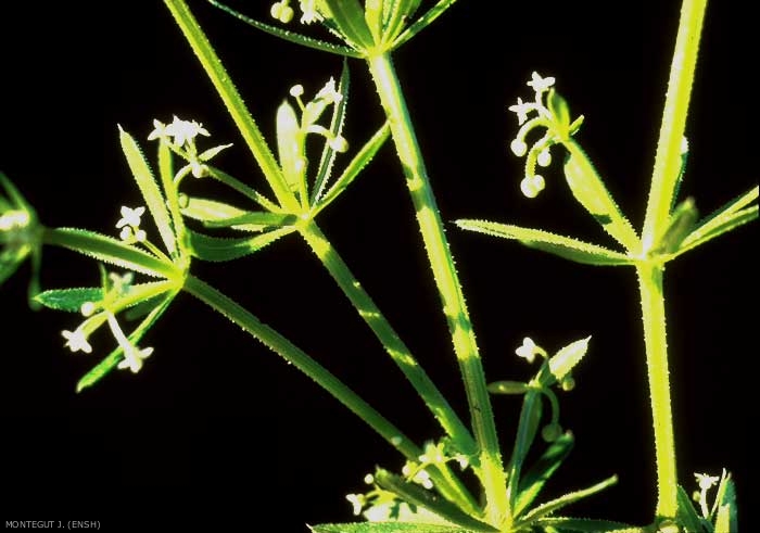 Feuilles verticillées par 6 ou 8, lancéolées, linéaires, mucronées, sans poil à la face supérieure et munies de petits aiguillons recourbés sur les bords et la nervure principale de la face inférieure