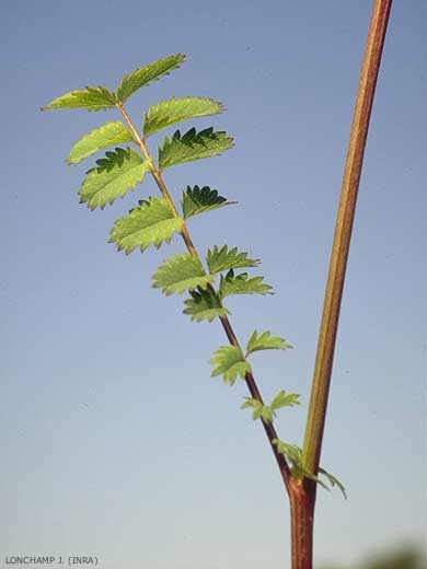 Feuilles inférieures de 9 à 25 folioles ovales, arrondies dans leur contour et bordées de crénelures. Plus haut sur la tige, feuilles à folioles moins nombreuses, plus allongées devenant aiguës et profondément dentées en scie. Folioles portées par de petits pétioles secondaires ;