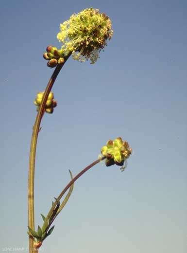 Fleurs verdâtres en tête globuleuse. Enveloppe florale réduite au calice. Sépales ovales vert-pourpre ou rouge-brunâtre. Épis courts, denses, souvent globuleux d'un rouge brunâtre ou d'un pourpre rosé ;