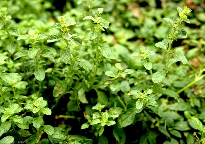 Tiges quadrangulaires couchées à ascendantes, légèrement duvetées à glabres, vert clair, à rejets aériens ;