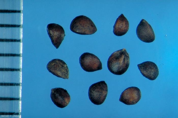 Forme : ovoïde arrondie avec 1 face convexe un peu aplanie, l'autre diédrique. Le hile est étroit, légèrement proéminent ;