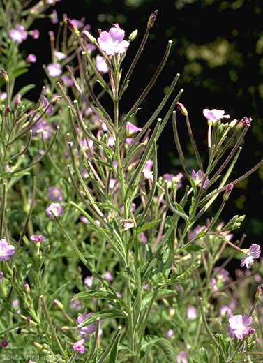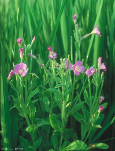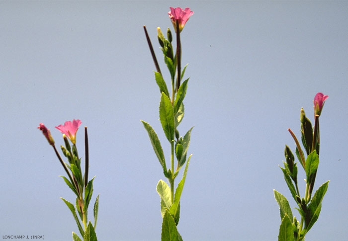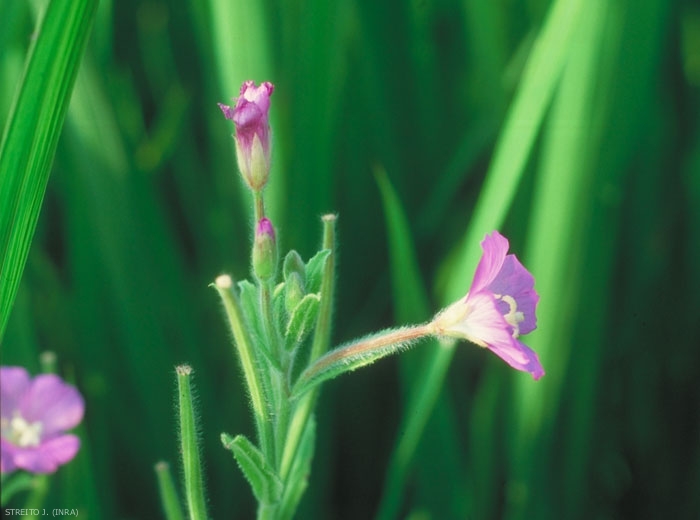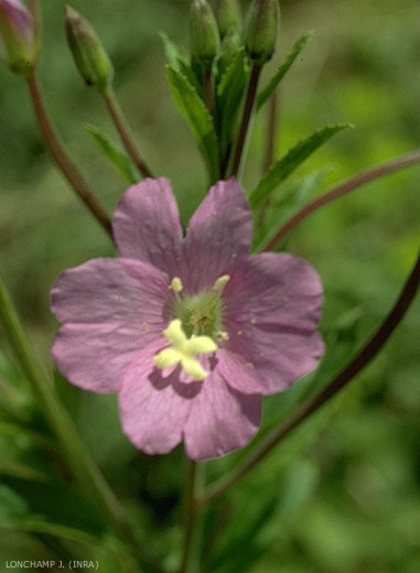 Fleurs rose pourpre, grande (2 cm) à long ovaires rappelant le pédoncule floral, stigmates à 4 lobes en croix