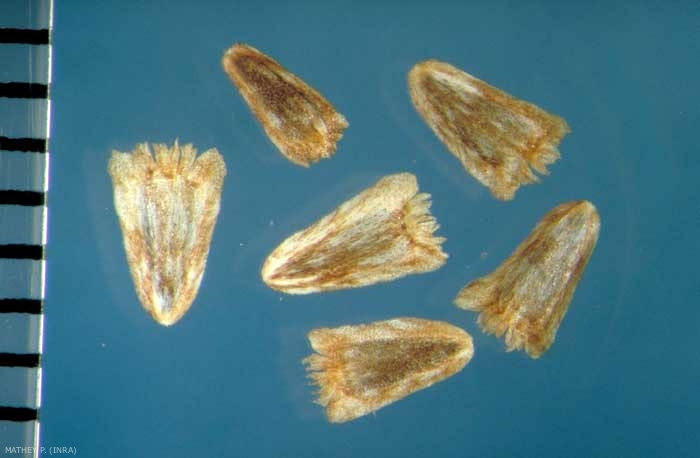 Forme : conoïde aplatie, munie d'une petite collerette. Ailes membraneuses blanchâtres de 0,3-1,0 mm redressées, aiguës