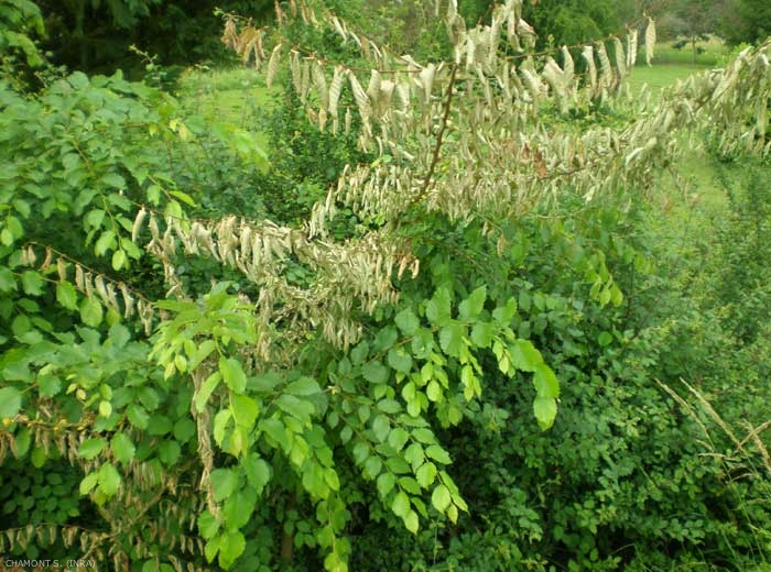 Concernant les jeunes arbres ou les moins développés, ce phénomène apparaît brutalement et entraîne rapidement la mort de tous les rameaux, et ce, dans le courant des périodes chaudes de l'année. En quelques jours la totalité du feuillage jaunit en se recroquevillant pour ne laisser très rapidement que des feuilles mortes sur l'ensemble des branches.