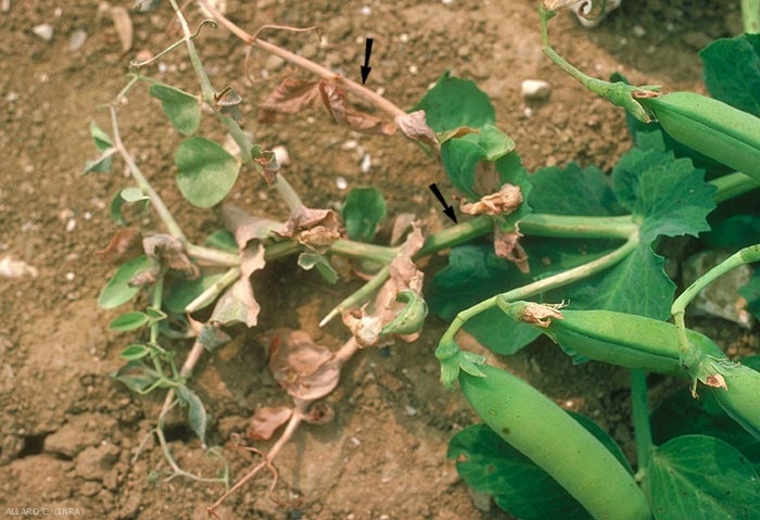 Aphanomyces euteiches est un oomycète qui attaque les racines du pois et les détruits (figure 1). La rotation de la culture du pois protéagineux sur 4 à 5 ans vise à limiter sa présence dans le sol.