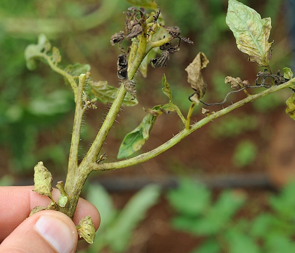 - tenter d’éradiquer le ou les premiers foyers en éliminant les premières plantes atteintes et/ou en traitant localement ces dernières et les plantes environnantes. Pour être efficaces à l’égard des tarsonèmes, les applications devront faire intervenir un volume important de bouillie et ceci avec suffisamment de pression afin d’accéder au « cœur » de la végétation. Il conviendra de contrôler dans le temps l’efficacité des traitements (notons qu’aucun pesticide n’est autorisé pour un usage tomate dans e-phy et que P. latus a développé dans le monde une résistance à plusieurs pesticides) ;