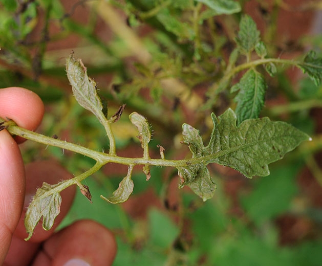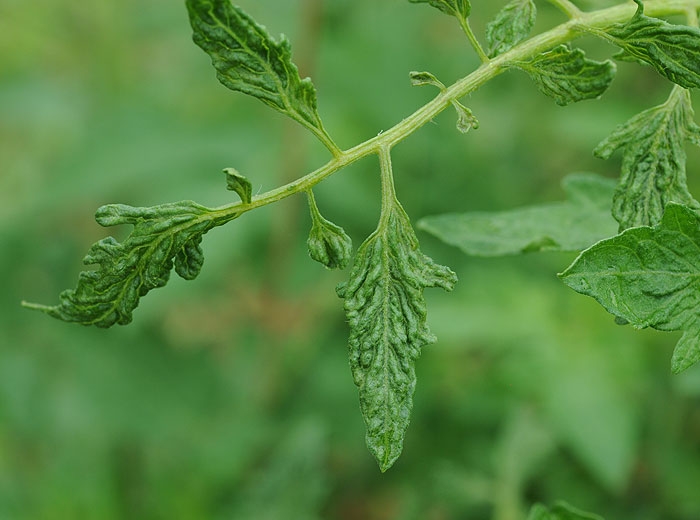 Les piqûres réalisées par P. latus sont à l’origine de déformations foliaires plutôt marquées et spectaculaires, les bourgeons et les jeunes feuilles étant particulièrement déformés. Notons que ces symptômes rappèlent ceux provoqués par les herbicides de type hormone sur tomate, et à un moindre dégré ceux des certaines viroses.