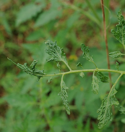 Les feuilles s’enroulent fortement, elles sont aussi plissées, plus épaisses et rigides. Elles présentent parfois une teinte bronze à brunâtre, et leur face inférieure à des reflets métalliques. Des zones de tissus brunâtres et subérisés apparaissent sous les feuilles, sur les pétioles…
