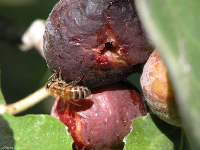 Le frelon européen (Vespa crabo) et les guêpes (Hymenoptera, Vespidae) sont responsables de la dégradation des fruits sur l'arbre dont ils se nourrissent.