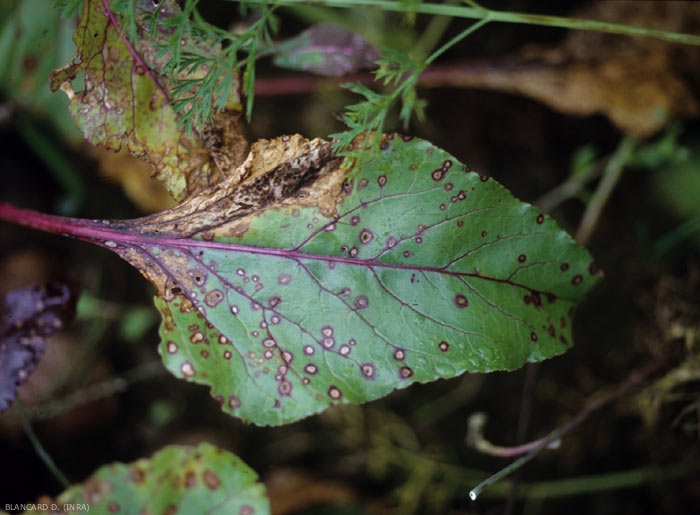 Sur feuilles la cercosporiose est une maladie fréquente caractérisée par des petites taches rondes bordées de rouge, causée par le champignon Cercospora beticola (Ascomycota, Dothideomycetes, figures). Cette maladie cause des pertes importante en poids et sucre de la racine. Elle peut être confondue avec la ramulariose (Ramularia betae, Ascomycota Dothideomycetes) provoquant des taches brunes en fin de saison.