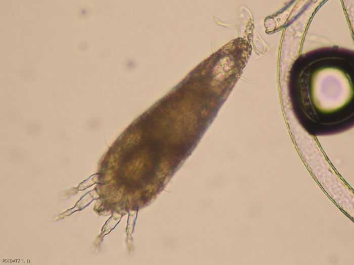 La femelle mesure 0,25 mm, avec un corps jaune pâle et blanc de forme allongée, avec deux paires de pattes et cinq stylets, dont deux crochets (photo). Chacune des femelles pond une cinquantaine d’œufs qui éclosent, en moyenne, au bout de sept jours.