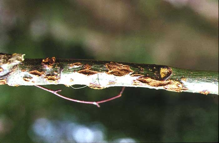 Sur les branches voire les troncs, on observe des lésions corticales plus ou moins grandes et profondes suivant la taille des grêlons et la violence de la grêle. Ces lésions sont généralement plus fréquentes sur la partie supérieure des branches et sur la partie du tronc située face à la direction des grêlons.