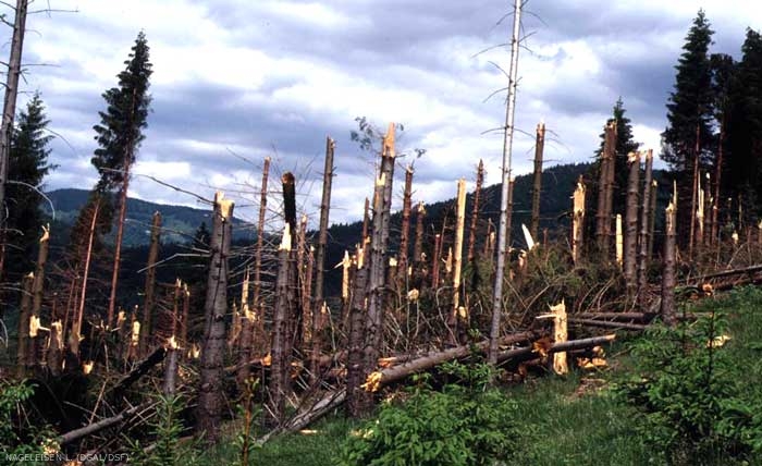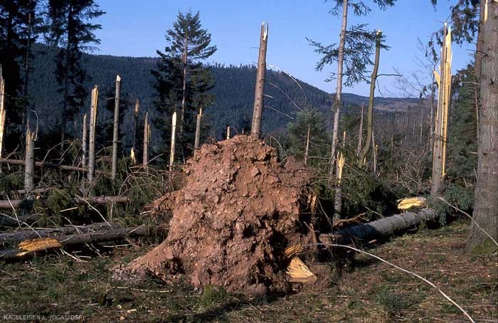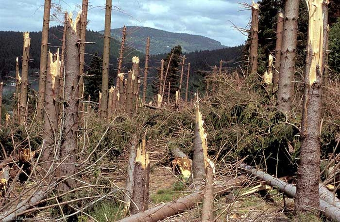 Les tempêtes, ouragans et tornades sont la cause de dégâts variés : arbres penchés, chablis, et bris de cimes, … qui constituent la principale de cause de dommages forestiers actuellement, bien avant les dépérissements ou les dommages biotiques.