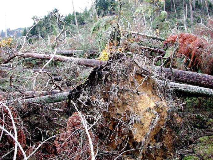 L’intensité et la gravité des dégâts dus au vent dépendent de nombreux facteurs : vitesse et direction du vent, accompagnement de précipitations plus ou moins fortes, nature du sol, expositions, pente, type d’essence, âge, conduite des peuplements (développement du système racinaire, prise au vent…).