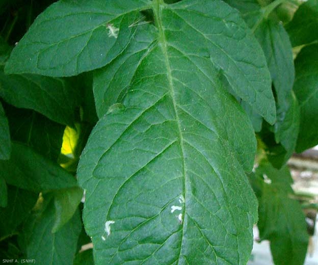 Les attaques se manifestent sous forme de plages blanchâtres qui, observées à la loupe, se révèlent être des galeries (seul l’épiderme* de la feuille subsiste, le parenchyme étant consommé par les larves) renfermant chacune une chenille (figures 1 et 2). Ces mines sont souvent arborescentes, avec des ramifications partant de la galerie principale.