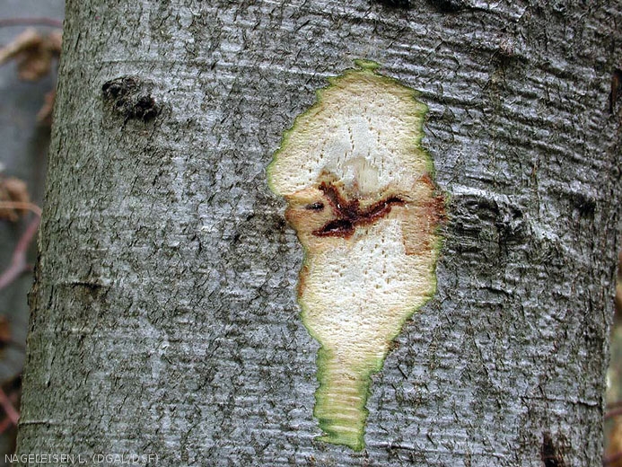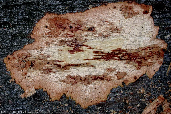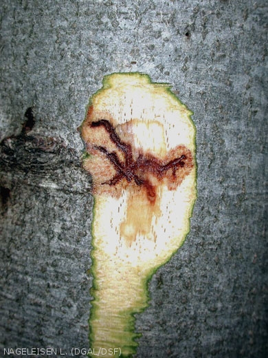 Des attaques en cours peuvent se traduire par des suintements noirâtres au niveau de l'écorce. Un écorcage révèle les galeries sous-jacentes au niveau du cambium.