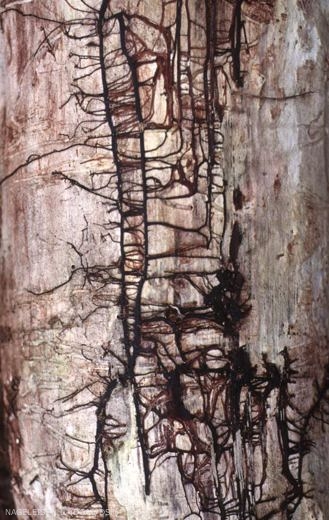 - Rhizomorphes sous-corticaux aplatis bruns plus ou moins ramifiés.