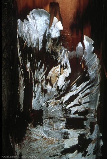 - Mycélium blanc en "peau de chamois" sous l'écorce au niveau des racines et du collet pouvant se différencier en palmettes sous-corticales blanches à brunes.