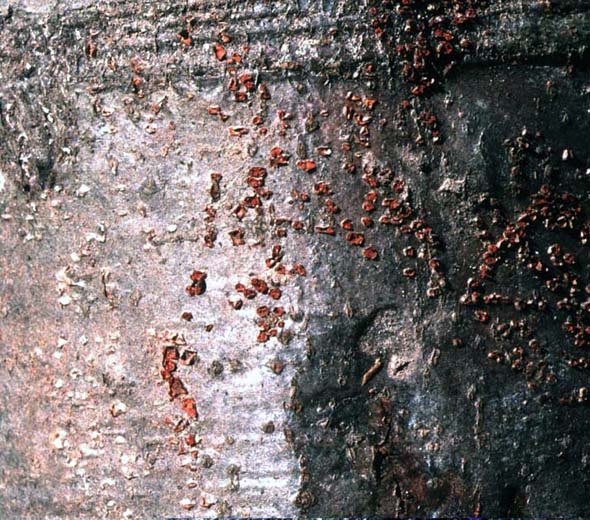 Le mycélium issu de la germination des spores colonise les tissus vivants superficiels du sujet ; son action se traduit extérieurement par la présence de zones déprimées qui évoluent en chancre par suite des réactions de l'hôte (zone nécrosée limitée par un bourrelet cicatriciel). A la périphérie des chancres, apparaissent des coussinets blanchâtres de 1 à 2 mm correspondant aux fructifications asexuées du champignon. Elles se forment toute l'année en conditions favorables.