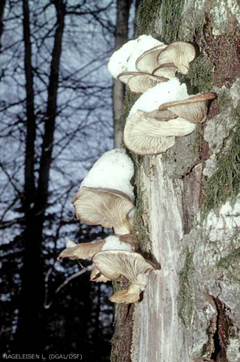 - Fructifications en général sous forme de consoles, visibles sur le tronc et les branches, émettant une profusion de spores dans l’atmosphère. Celles-ci vont contaminer un arbre au niveau de blessures ou de fissurations de l’écorce.