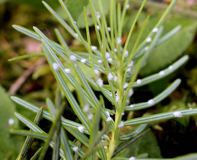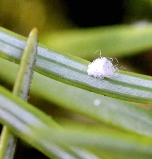- Douglas : sur aiguilles au début du printemps, larves sous la forme de petits points noirs à la face inférieure des feuilles, puis apparition de petites boules blanches correspondantes aux insectes recouverts de sécrétions cireuses (figures 1 et 2). En été, taches jaunâtres dues aux piqûres et déformations des aiguilles.