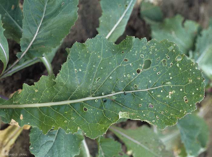 Les adultes rongent les feuilles, laissant des traces de morsures caractéristiques, qui ne traversent généralement pas la feuille. Dans certains cas, celle-ci est percée d’un trou rond, qui s’élargit lors de la croissance du végétal (figure 2 et 3).
