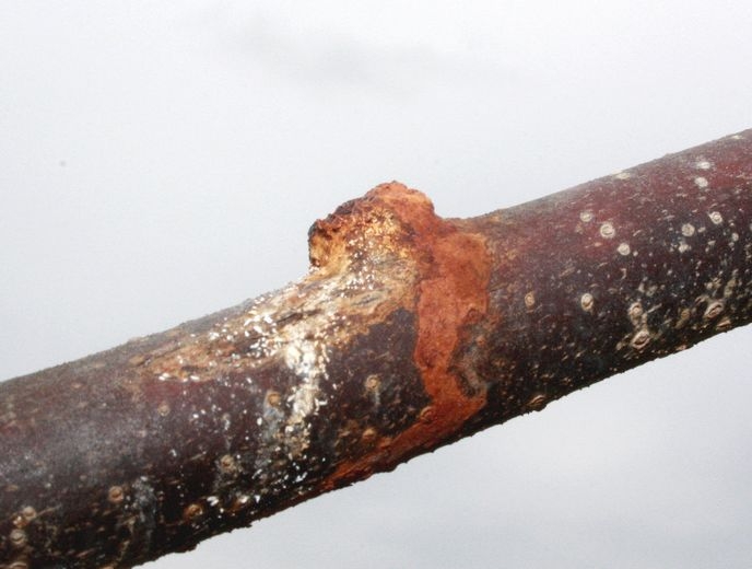 Des chancres peuvent être observés sur les troncs et les branches (figure 2). Un liquide gommeux (exsudat) (figure 3) s’en écoule parfois, dont la couleur varie du blanchâtre au brunâtre. Les tissus situés sous l’écorce peuvent également montrer des traînées brunes.