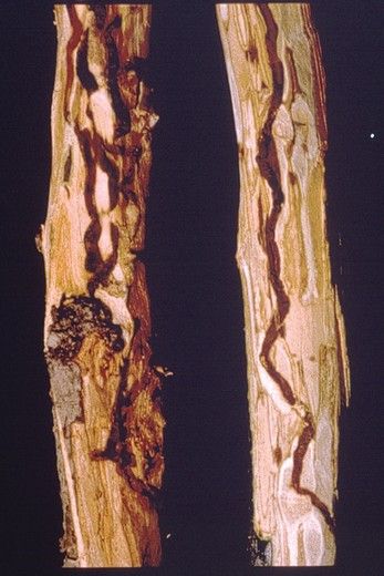 L’attaque du ravageur se traduit au départ par le dessèchement brutal et épars de quelques branches. Puis, à terme, les arbres attaqués sont condamnés (Figure 1) par le développement des larves (Figure 2) qui interrompent les flux de sève .