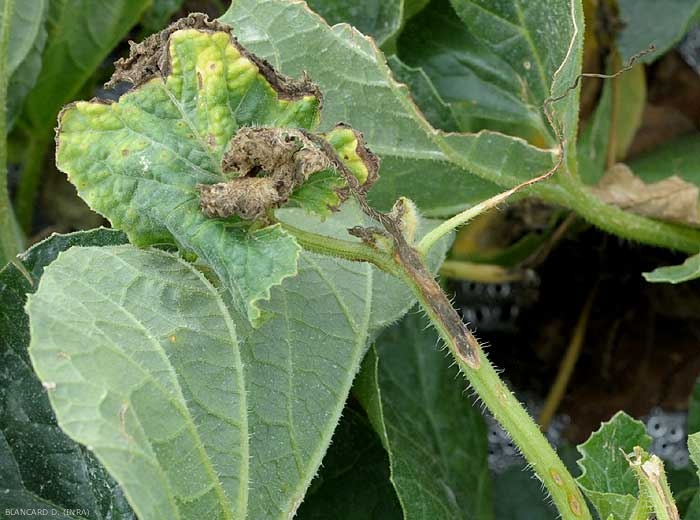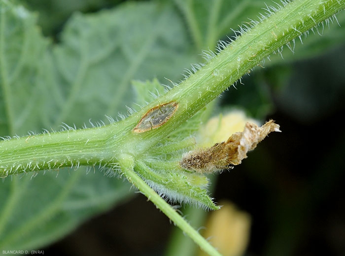 Des lésions chancreuses, creuses sont aussi visibles sur les tiges (figure 3) et les fruits (figures 4 et 5).