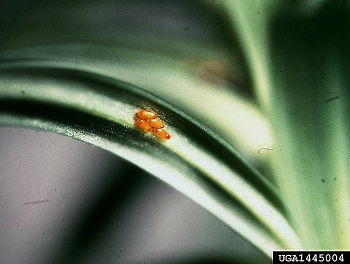 L’insecte est un petit coléoptère rouge qui mesure environ 8 mm de long, avec des pattes et des antennes noires. Il apparaît dès les premiers jours doux au printemps et se reproduit très rapidement. Chaque femelle peut pondre 200 à 300 œufs par saison. Ces œufs (figure 1) sont rouges et petits, pondus généralement sous les feuilles par lots, souvent alignés.