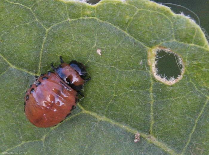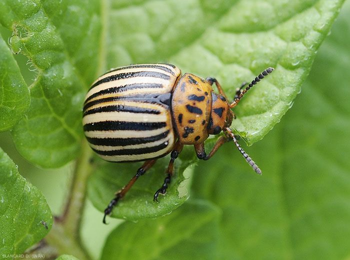 Les insectes et les larves visibles à l’œil nu dévorent les feuilles de pomme de terre. L’insecte adulte (figures 1, 2, 3 et 4) a un corps ovale, très bombé et mesure 10 à 11 mm de long. La tête et le haut du corps sont de coloration brun roux et présentent plusieurs taches noires. Les élytres sont jaunes et ornés de 10 bandes longitudinales noires. Les larves sont rouge orangé (figures 5 et 6) et mesurent 1,5 à 2 mm de long à l’éclosion. Elles atteignent la même taille que les adultes vers la fin de leur développement, en restant rouge plus ou moins foncé. Les œufs (figure 7) sont jaune-orange, longs de 1,5 mm, fixés par paquets de 10 à 30 sur la face inférieure des feuilles.