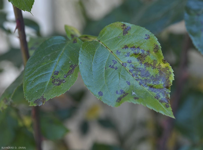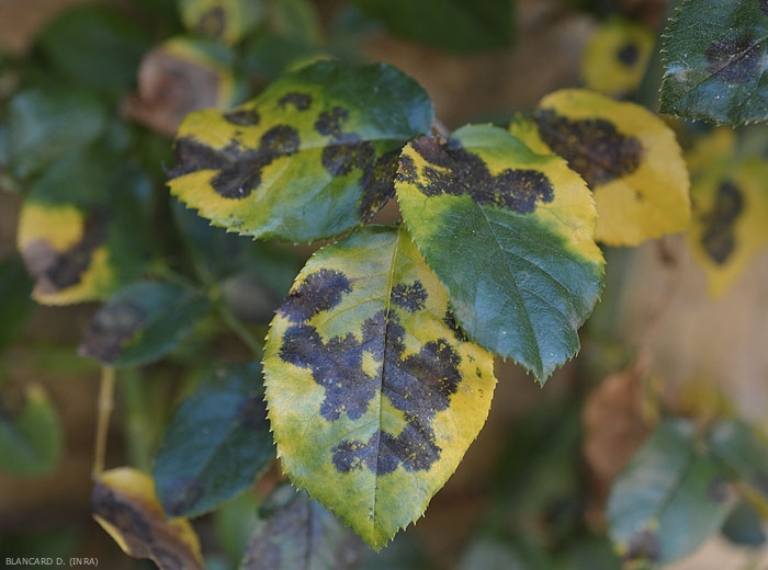 Le champignon produit sur les feuilles de rosier des taches noires plus ou moins circulaires, mesurant de 10 à 15 mm de diamètre (figure 1). Celles-ci en se développant peuvent fusionner pour former de larges plages noires (figure 2). A la périphérie de ces taches, le limbe prend une coloration jaune qui gagne progressivement toute la foliole qui finit par chuter prématurément.