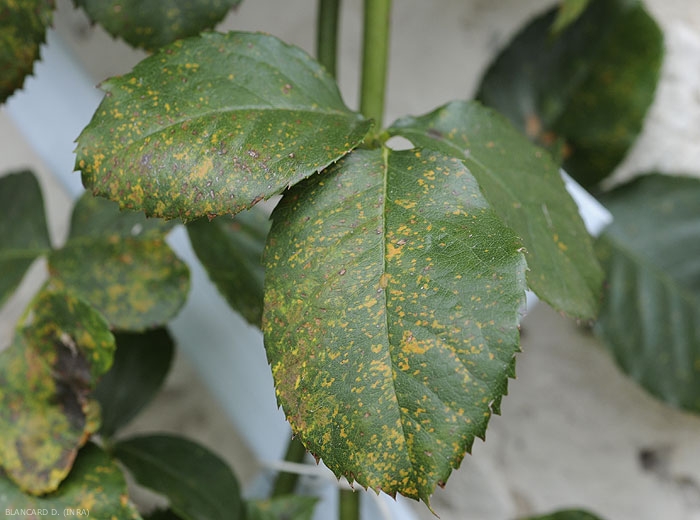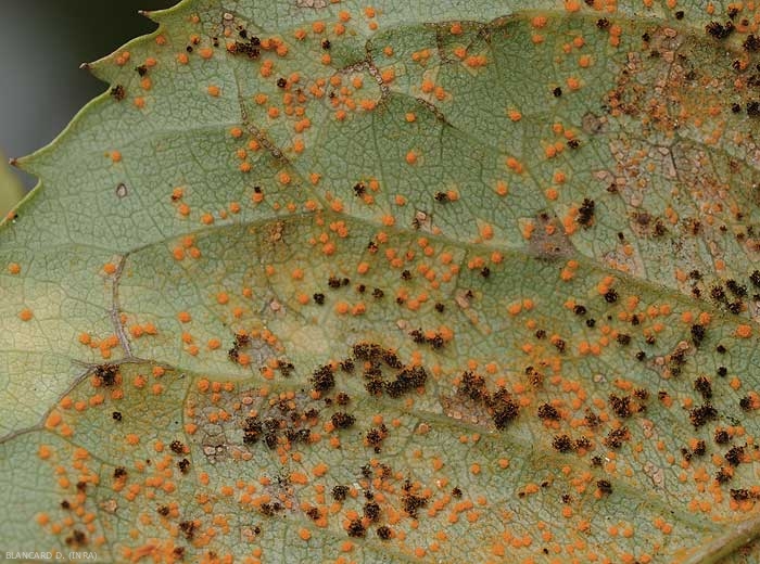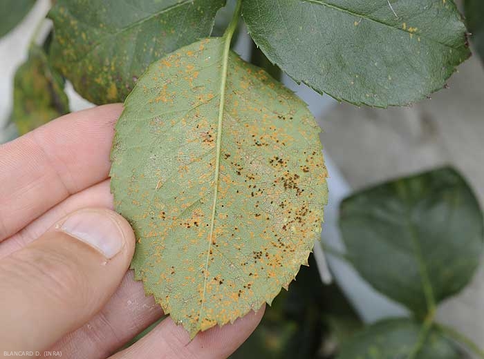 Notons que les symptômes de la maladie des taches noires peuvent etre observés en même temps que ceux de la rouille (figure 1). Cette dernière maladie fongique est à l'origine de petites taches plus ou moins angulaires, jaunes à oranges, se nécrosant progressivement (figure 2). Ce qui la caractérise, c'est la production de pustules possiéreuses  orangées et brunes à la face inférieure du limbe (figures 3 et 4).