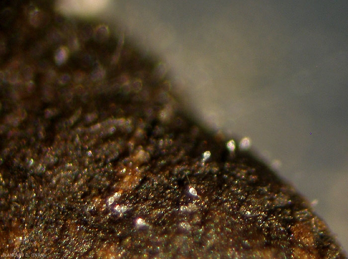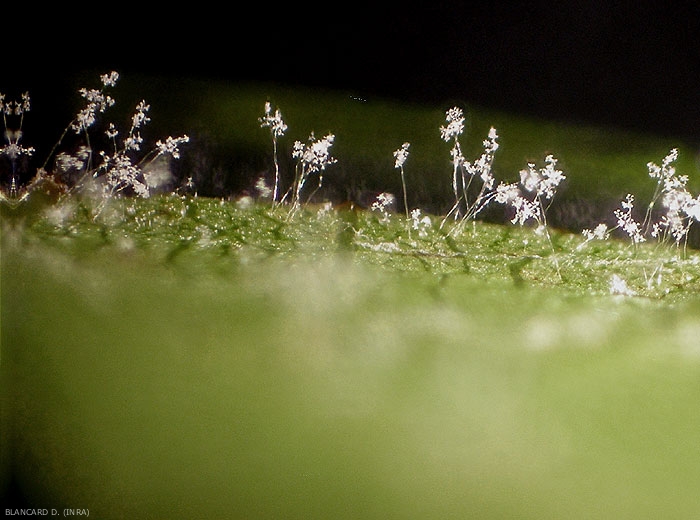 Les foyers primaires initiés sur les feuilles permettent la sporulation du mildiou et la formation dees sporanges (figures 4 à 6). Ces spores sont à l'origine des contaminations secondaires, permettant ainsi la dissémination de la maladie aux autres feuilles et aux ceps voisins.