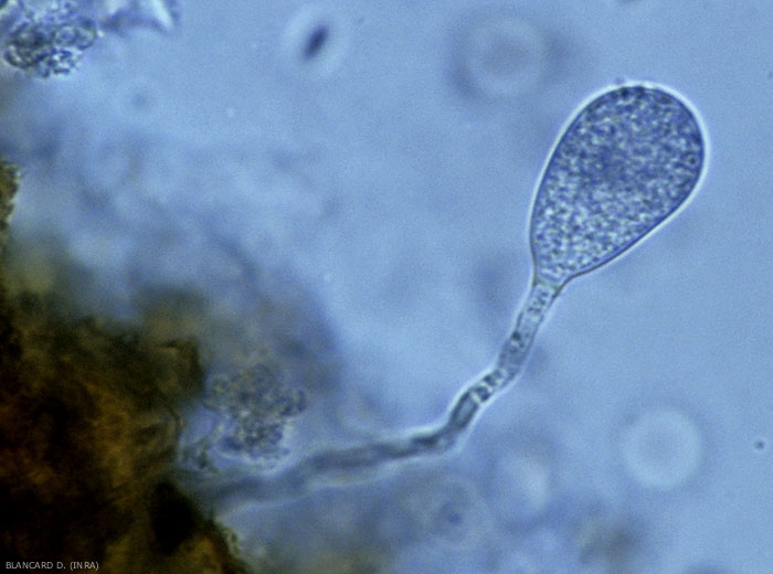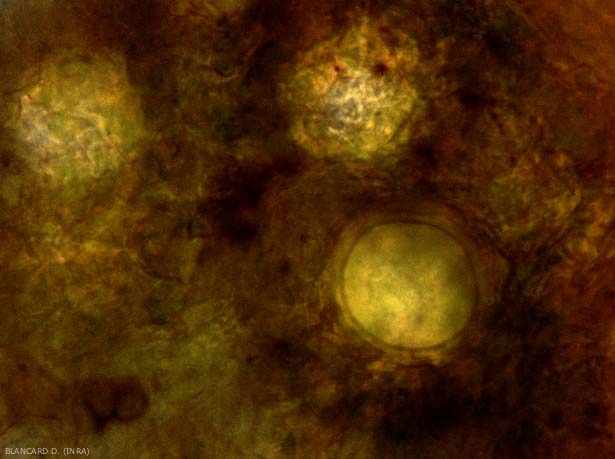 L'agent du mildiou passe l’hiver grâce à des organes de conservation (des oospores - figure 1), qui sont formés à l’intérieur des tissus végétaux et se retrouvent dans les débris de culture à l’automne, puis à la surface ou dans le sol en hiver.