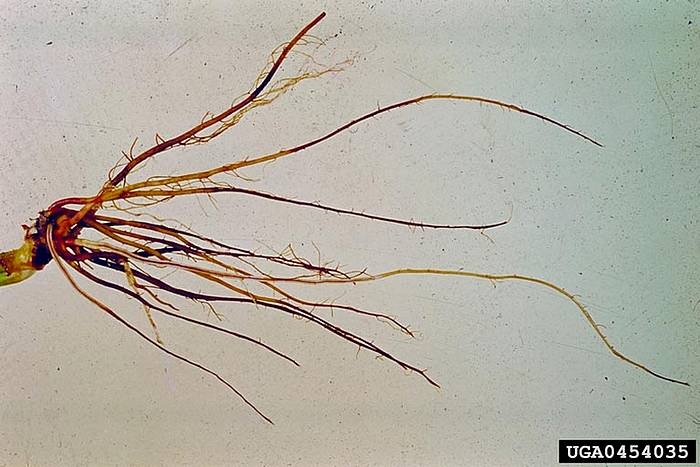 Les racines présentent des zones nécrosées sur toute leur longueur (comparer figures 1 et 2). Ces zones alternent avec des parties saines. Les radicelles sont rares. En coupe, on observe à l’intérieur des racines un cylindre central rouge sang très caractéristique.