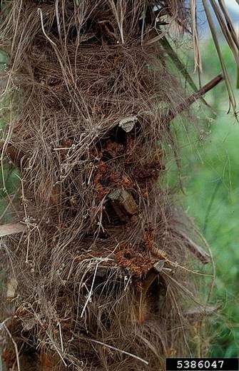 Les galeries creusées par les chenilles peuvent causer la mort du palmier hôte