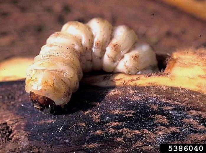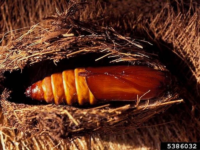 Les œufs ont la taille et l’aspect de grains de riz. La chenille, de couleur blanche, peut atteindre 1 cm de diamètre et 8 cm de long (figure1). La chysalide est marron (figure 2).