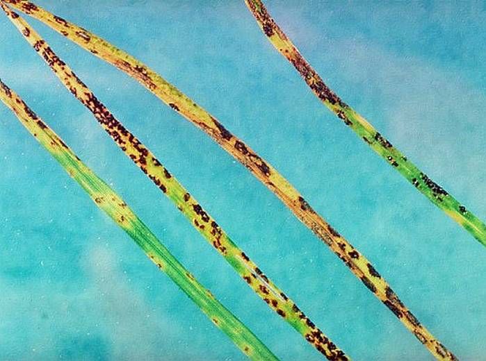 Observée à distance, la rouille se manifeste par un dessèchement du gazon qui jaunit, puis roussit (figure 1). De près, les feuilles sont recouvertes de pustules jaunes, orangées ou brunes qui sont remplies de spores du champignon (figure 2).